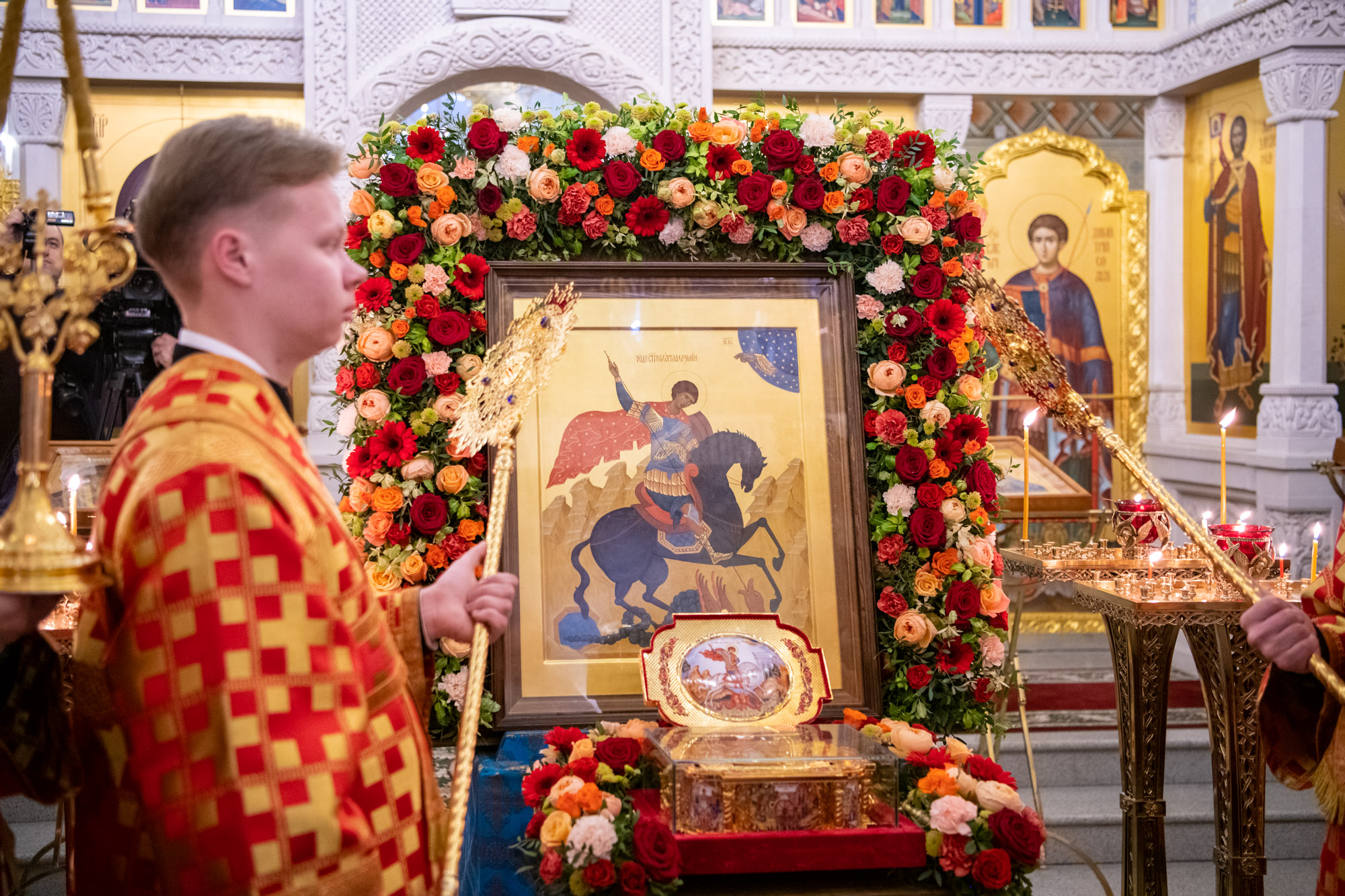 Ковчег с мощами великомученика Георгия Победоносца сегодня будет находиться в Успенском (Михаило-Архангельском) соборе до 19:00. Затем состоятся торжественные проводы святыни в Курскую митрополию.