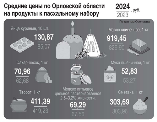 Как следует из ответа органа статистики на запрос «ОВ», средние цены по Орловской области на продукты к пасхальному набору в расчете на 1 кг масла сливочного, сметаны, творога, сахара, муки, а также литра молока и десятка яиц в общей сложности выросли на 87 руб., или с 1822 до 1908,5 руб.