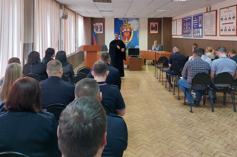 Клирик Иверского храма города Орла иерей Максим Удовиченко встретился с руководством и личным составом линейного отдела МВД России на станции Орел.