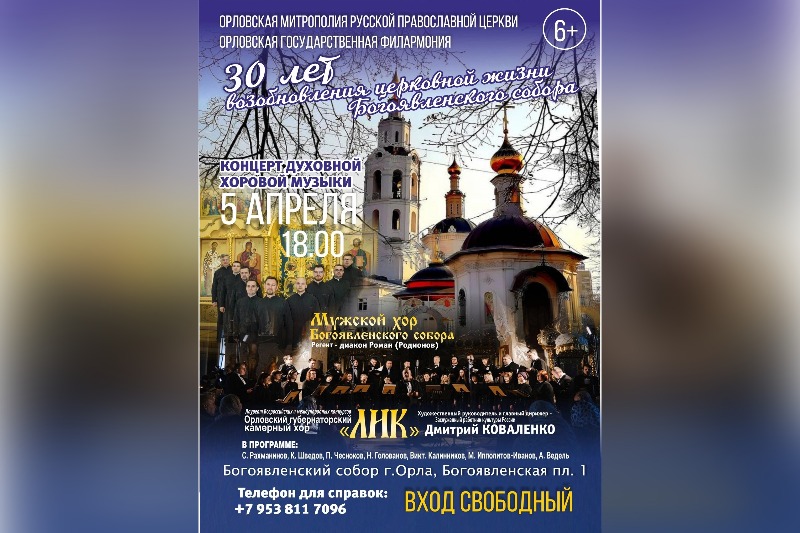5 апреля в Орле пройдет концерт духовной хоровой музыки. В этот вечер в Богоявленском соборе выступят Орловский губернаторский камерный хор «ЛИК» (художественный руководитель и главный дирижер — заслуженный работник культуры России Дмитрий Коваленко) и мужской хор Богоявленского собора (регент — диакон Роман Родионов).