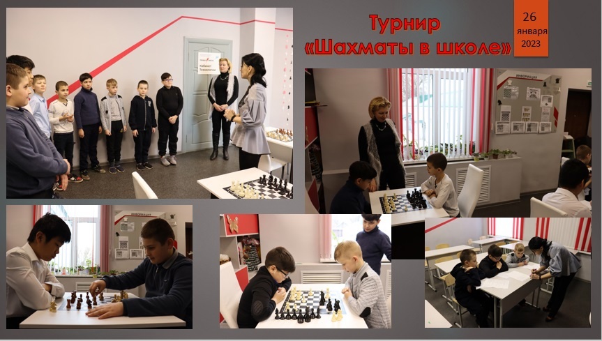 26 января 2023 года на базе Центра Точка роста, состоялся турнир «Шахматы в школе». Шахматный турнир– это развитие памяти и внимания, смекалки и математических способностей, логики и фантазии. Все эти качества юные шахматисты смогли показать на шахматном турнире. В рамках турнира для участников прошло еще одно испытание в виде тестирования, на шахматные знания.