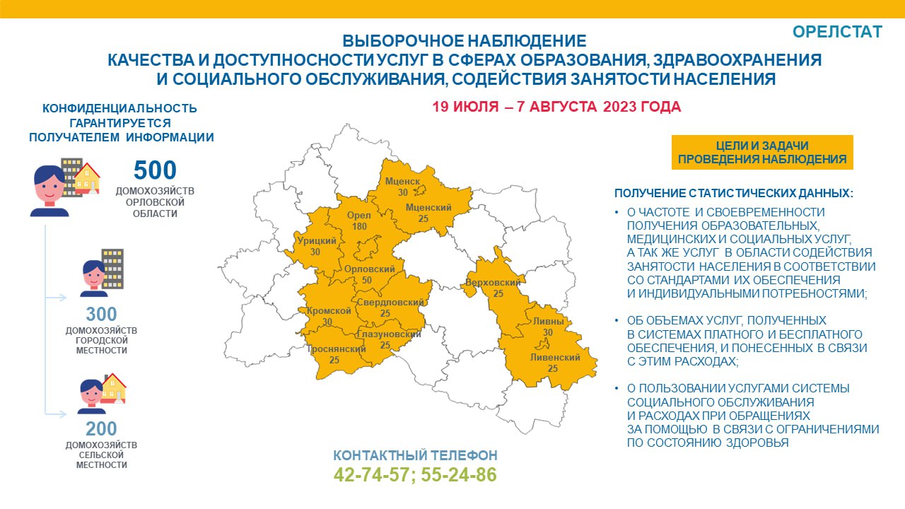 «Выборочное наблюдение организуется в целях получения статистической информации, отражающей фактические потребности населения в получении образовательных и медицинских услуг, социальном обслуживании, услуг в области содействия занятости населения, удовлетворенность населения объемом и качеством полученных услуг, их влияние на уровень благосостояния семей», — констатируют в Орелстате.