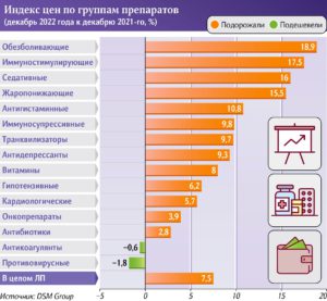 По итогам 2022 года цены на лекарства в РФ выросли в среднем на 7,5%, следует из данных аналитической компании DSM Group. Пальма первенства по подорожанию у обезболивающих – 18,9%, иммуностимуляторов – 17,5%, седативных средств – 16%. Жаропонижающие и антигистаминные дали рост в 15,5% и 10,8% соответственно.
