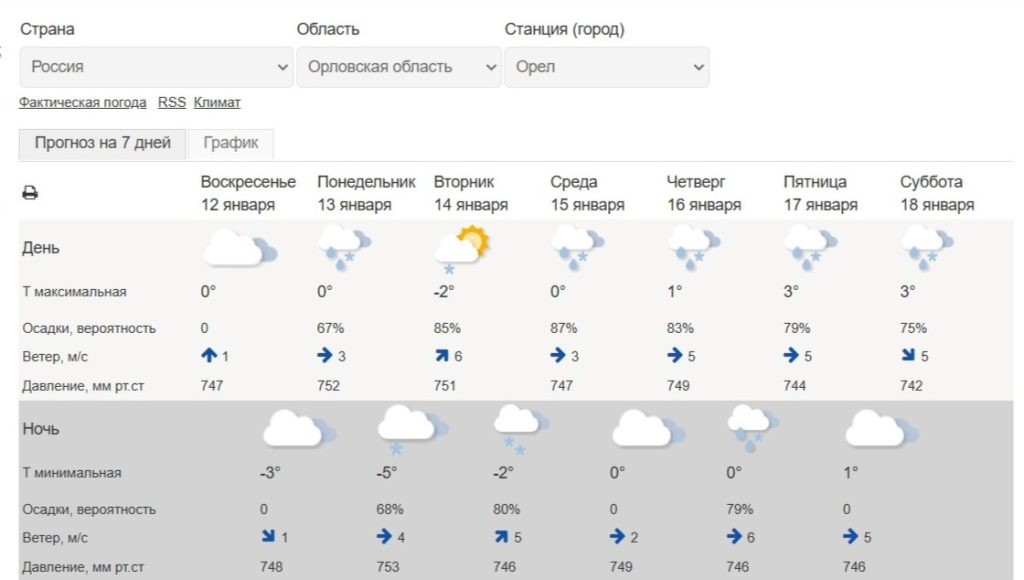 На фото прогноз погоды на ближайшую неделю в Орловской области. Источник: https://meteoinfo.ru/