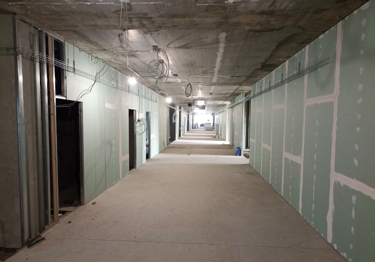 На втором этаже в помещениях проводится отделка. Монтируются лестницы и стояки. Также продолжаются работы по монтажу систем водоснабжения и водоотведения, электроснабжения, вентиляции.