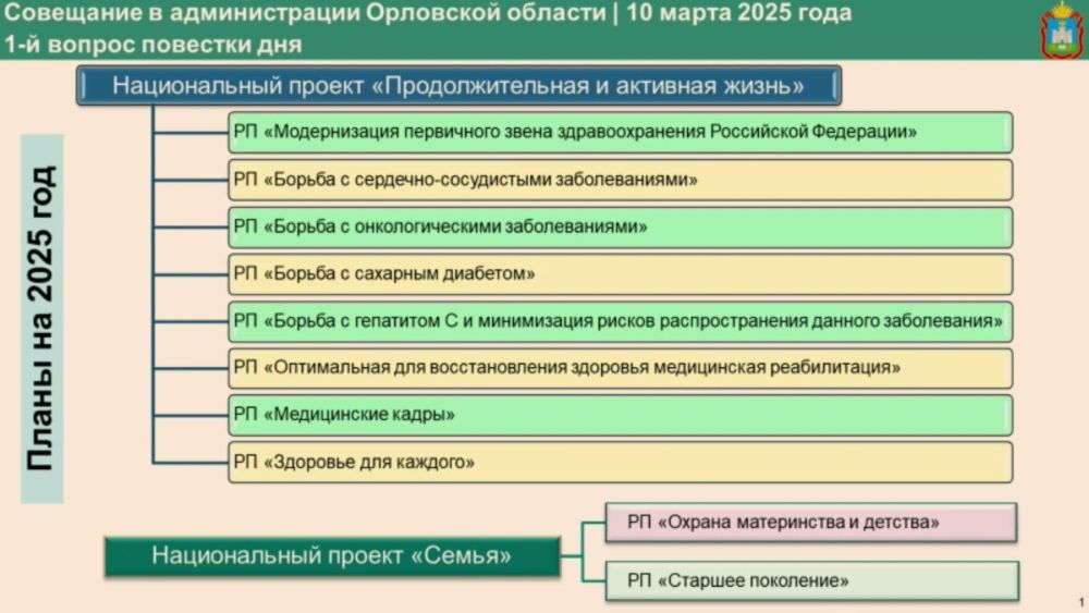 Как сообщил руководитель Департамента здравоохранения региона Александр Альянов, в рамках реализации национального проекта «Продолжительная и активная жизнь» Орловская область участвует в мероприятиях 8 региональных программ: