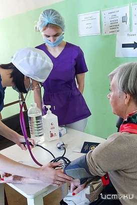 Студенты филиала медицинского колледжа помогают посетителям сориентироваться в медучреждении, оказывают помощь маломобильным группам граждан и измеряют давление пациентам.