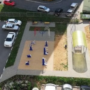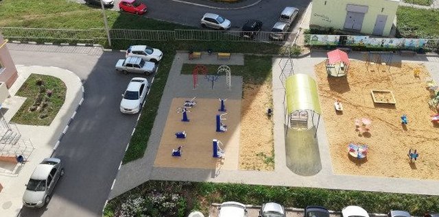 Парковка во дворе; рядом остановка, детская площадка.