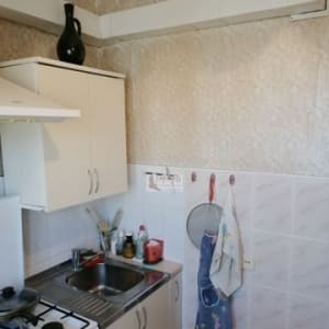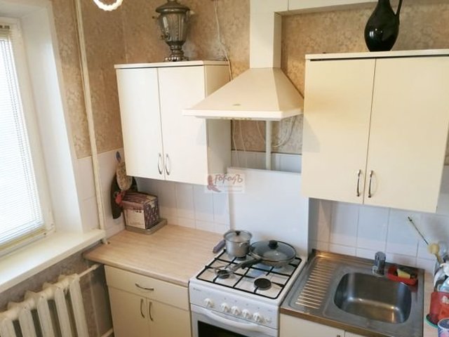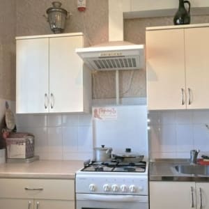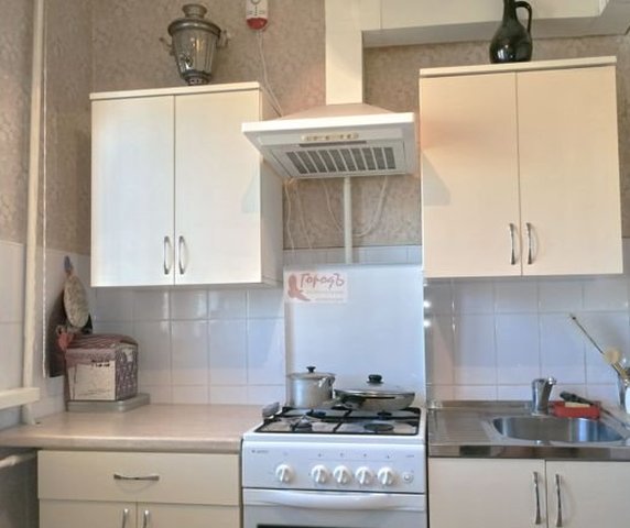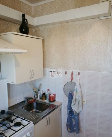 На кухне, площадью 5,6 кв. м, рабочая стена выложена светлым кафелем, остальные стены оклеены обоями в тон. Мойка металлическая, смеситель в хорошем состоянии.