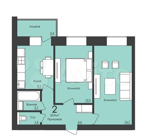 - Общая площадь: 50.9 м²