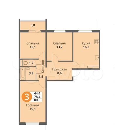 3-к квартира, 80 м², 7/16 эт.